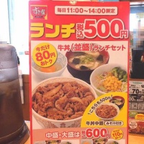 ワンコインすき家の牛丼ランチセット(足利葉鹿店)