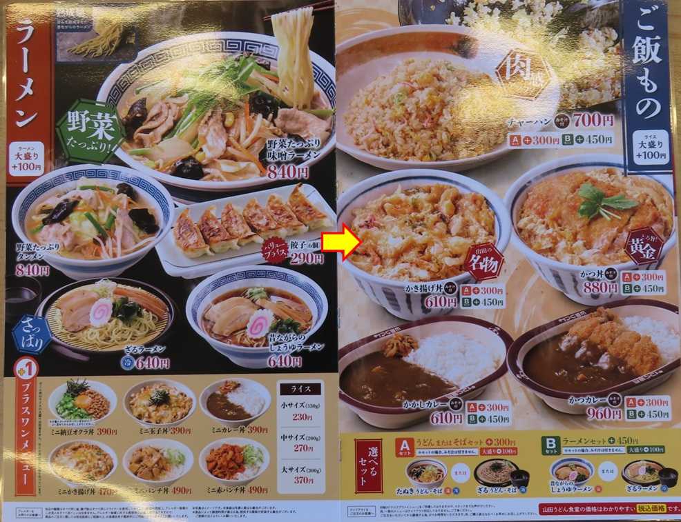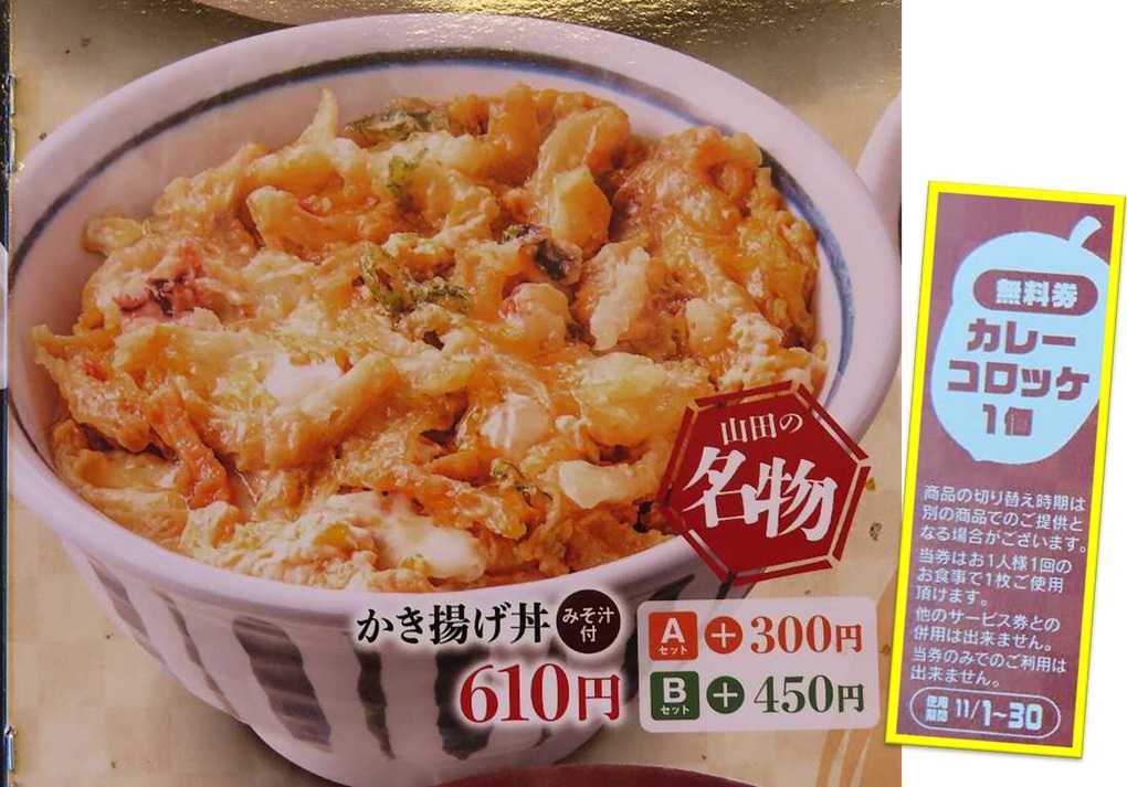 山田名物 かき揚げ丼 みそ汁付き610円🍚+カレーコロッケ無料券 2025年11月13日 04:11 山田うどん食堂邑楽町店山田名物かき揚げ丼+カレーコロッケ みそ汁付き610円味噌汁七味を少々・・・カレーコロッケかき揚げ丼 かき揚げが卵とじされてる数は少ないが食べてるとコリッと感じる物はイカだ 安くて美味しい御馳走様でした😋無料券が頂けました 「グルメ (なんでもあり)」カテゴリの最新記事 タグ :#山田うどん食堂#山田名物#かき揚げ丼#イカ#名物#無料券#味噌汁付き < 前の記事次の記事 > コメント このブログにコメントするにはログインが必要です。 さんログアウト この記事には許可ユーザしかコメントができません。 コメントフォーム 名前 コメント 記事の評価 リセット リセット 顔 星 情報を記憶 コメントを投稿する